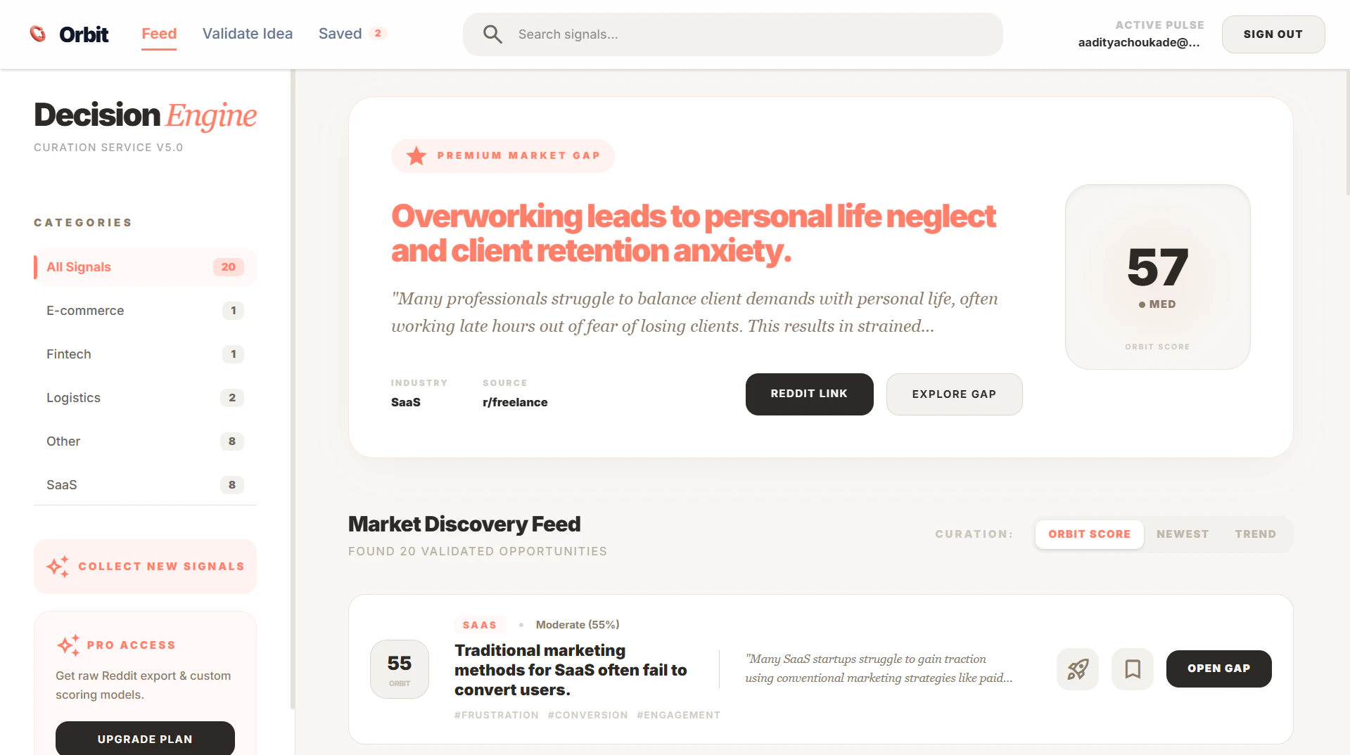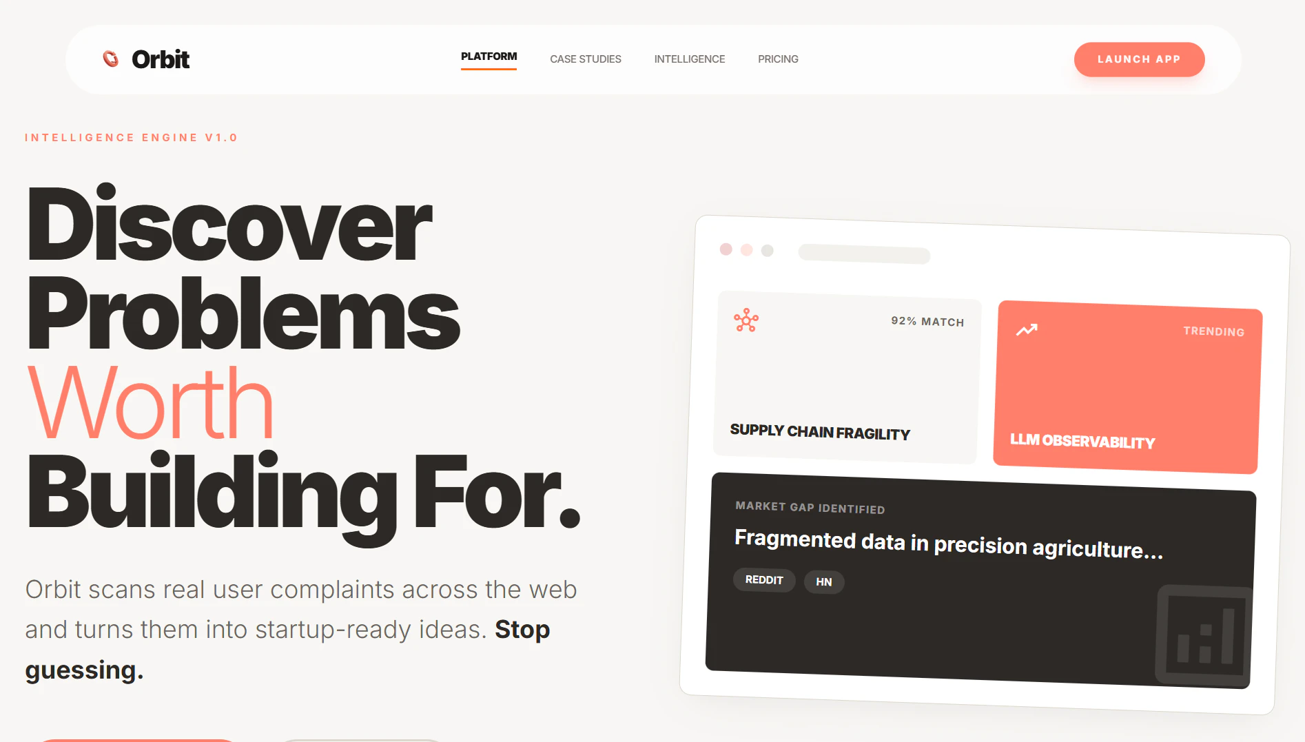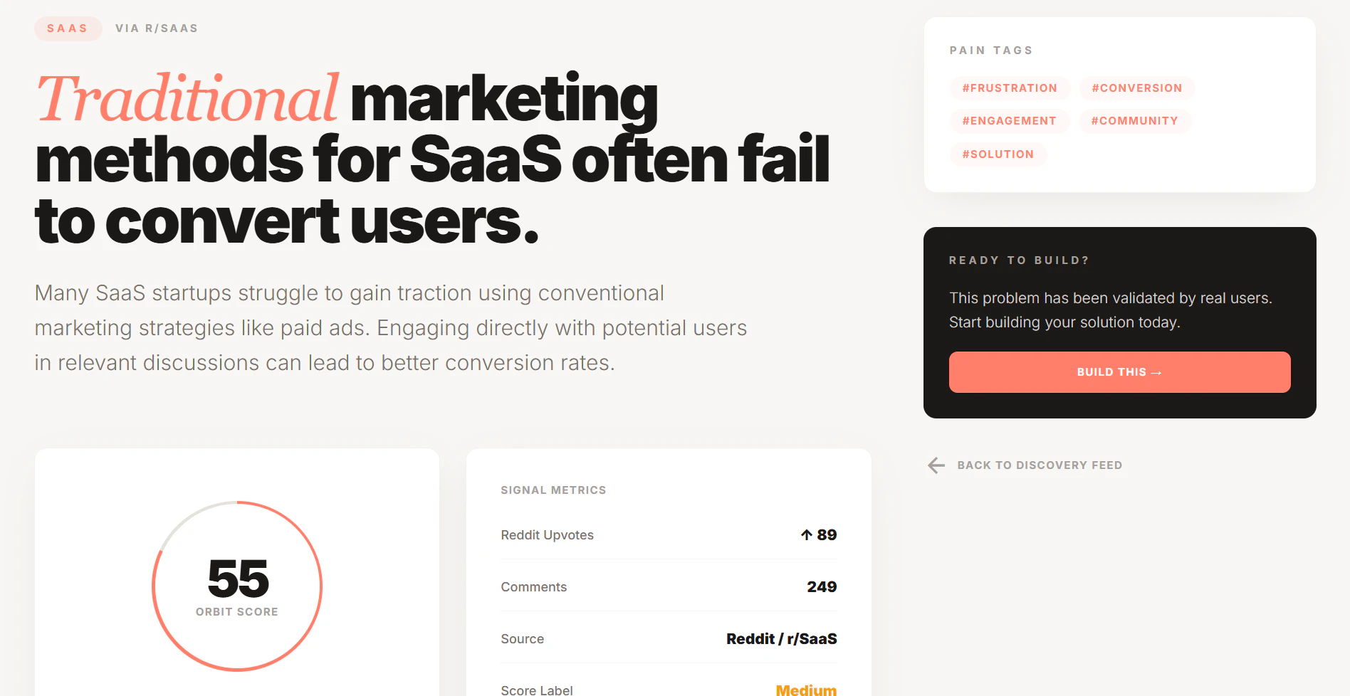 Meta 工具——帮你找创业方向的工具。类似 Exploding Topics / Gummysearch。对你:看它聚合数据源在哪(如果包含 Reddit / HN / PH),直接学方法论。