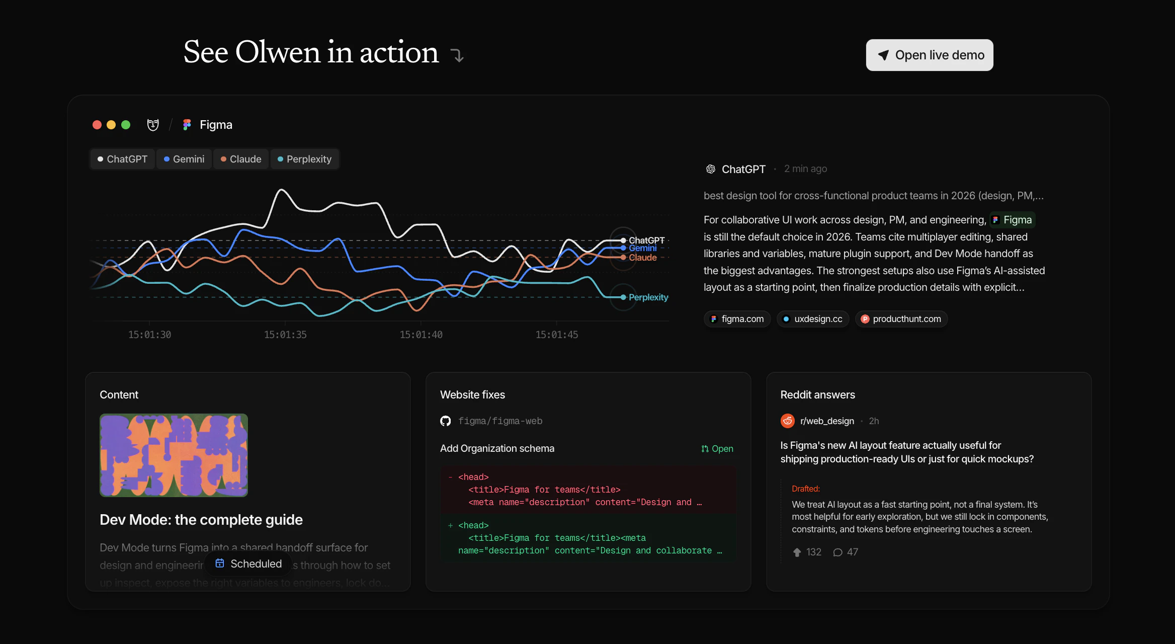**「GEO」这个词开始在 PH 出现** = 2026 SEO 新概念正在形成。独立开发者机会:做 GEO 的**垂直工具**(如 `llms.txt file generator`、`ai search visibility tracker`),而不是跟 Olwen 做 all-in-one。你 SEO 矩阵站方向也该同步补「内容对 AI 搜索友好」的处理。